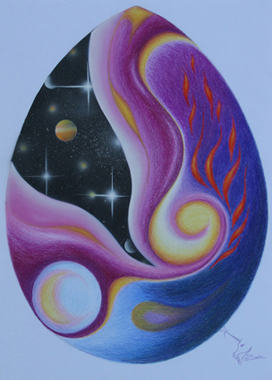 …Die innere Seite zeigt heftige Prozesse, vehemente Gegenwehr aus Selbstzweifel, die in vielen, schmerzhaften Auseinandersetzungen damit, nach und nach zu verbrennen vermögen. Der Einblick ins Weltall zeugt von Seelenwissen um Herkunft und von Heimweh zurück zu den eigenen Sternen…