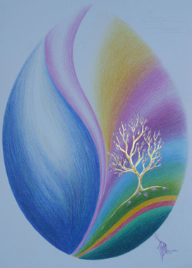 …Die hellen, beschwingten Regenbogenfarben weisen auf heile Chakras in gesundem Fluss hin, durch spirituelles Wachstum erlöst. Auch zieht sich die rosarote Farbe der mütterlichen Liebe schützend und stabilisierend als Begleiter liebevoll durch das ganze Leben…